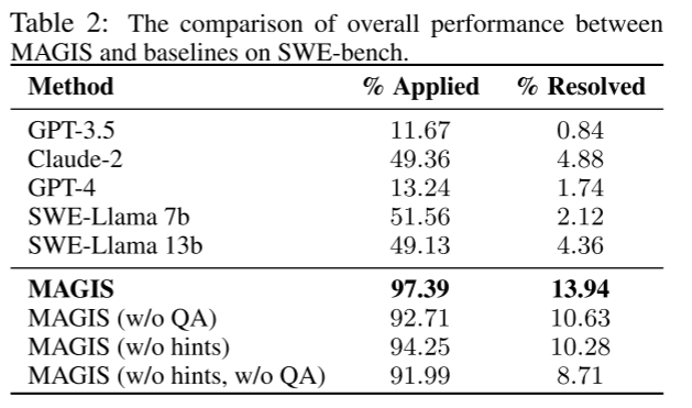 基于llm的多智能体框架MAGIS,以减轻现有llm在GitHub问题解决上的局限性。我们设计的四类代理及其在规划和编码方面的协作都释放了llm在存储库级别编码任务上的潜力。 - 我们在SWE-bench数据集上比较了我们的框架和其他强大的大语言模型竞争对手(即GPT-3.5, GPT-4和Claude-2)。结果表明,MAGIS显著优于这些竞争对手。进一步的分析证实了框架设计的有效性和必要性。