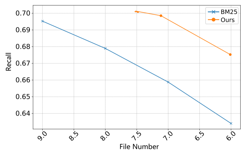 分析代码仓管家和经理智能体的性能。前者的性能可用召回率和文件数的关系曲线中观察,我们的方法在不同数量的选定文件中始终优于BM25基线,表明我们的方法可以用最小的选择确定相关代码文件的最大数量: