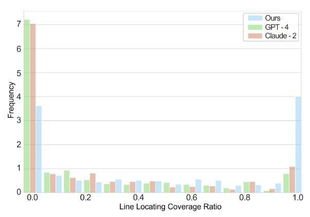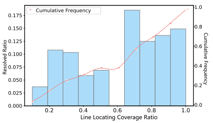 进一步,下图评估行定位覆盖率和问题解决率之间的关系。右侧的4个柱高于左侧的5个柱,这表明随着线定位覆盖率的增加,解决率会增加。
