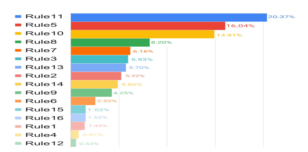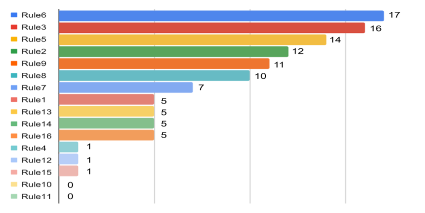 - 修复错误和扰动规则之间的相关性:将修复的缺陷映射到基于人工分析的相应摄动规则中,14/16摄动规则至少修复了一个错误程序,显示了它们的有用性和互补性。规则的训练样本数量与相应的错误不是线性相关的。
