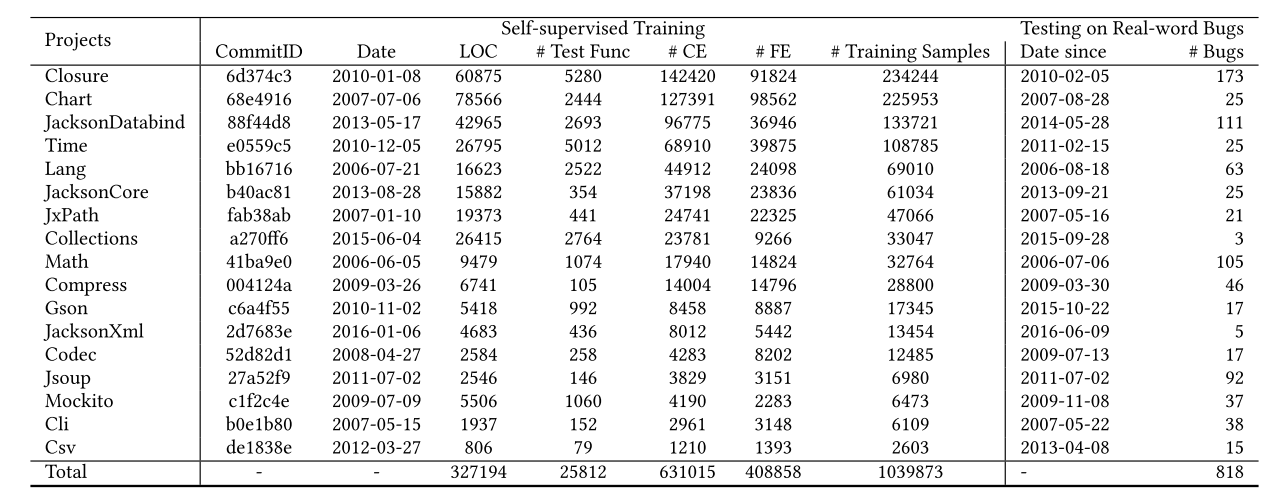 Defects4j2.0,内含17个开源项目的835个真实错误组成。训练集由这些代码的扰动构成.下表为训练测试集的具体信息。