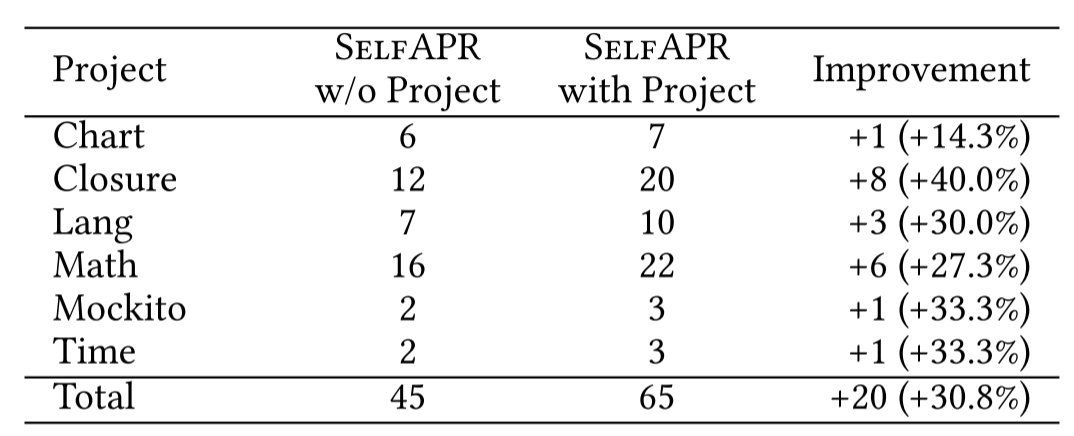 下图显示了使用和不使用项目特定训练样本时selfapr的有效性。第一列给出了D4J (v1.2)的测试项目。第二列显示了在没有特定于项目的训练样本的情况下正确修复的错误数量。第三列显示了通过包含特定于项目的示例修复的错误数量
