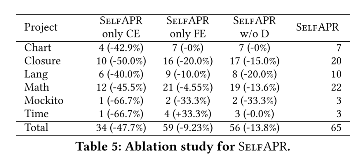 只有编译错误(CE),只有功能错误(FE),不包括诊断(SelfAPR w/o D)的训练样本上训练SelfAPR来进行消融研究。