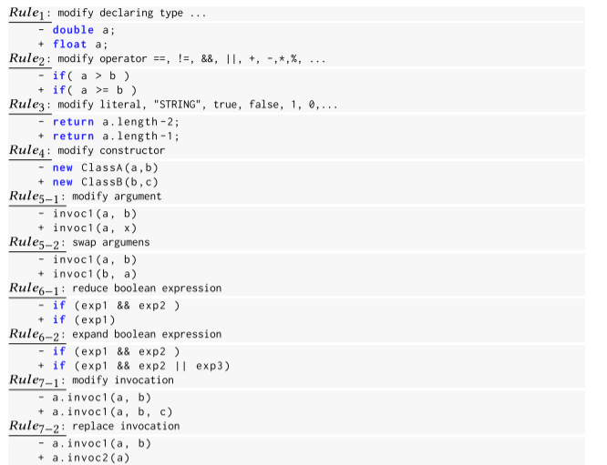 - 重用同一程序中的现代码。需要重用程序修复中的代码,鼓励扰动模型重用bug附件的源代码,变现为规则中包含移除的方法鼓励字句重用。