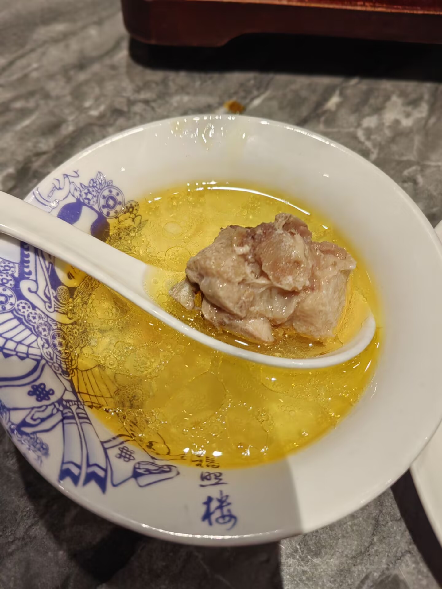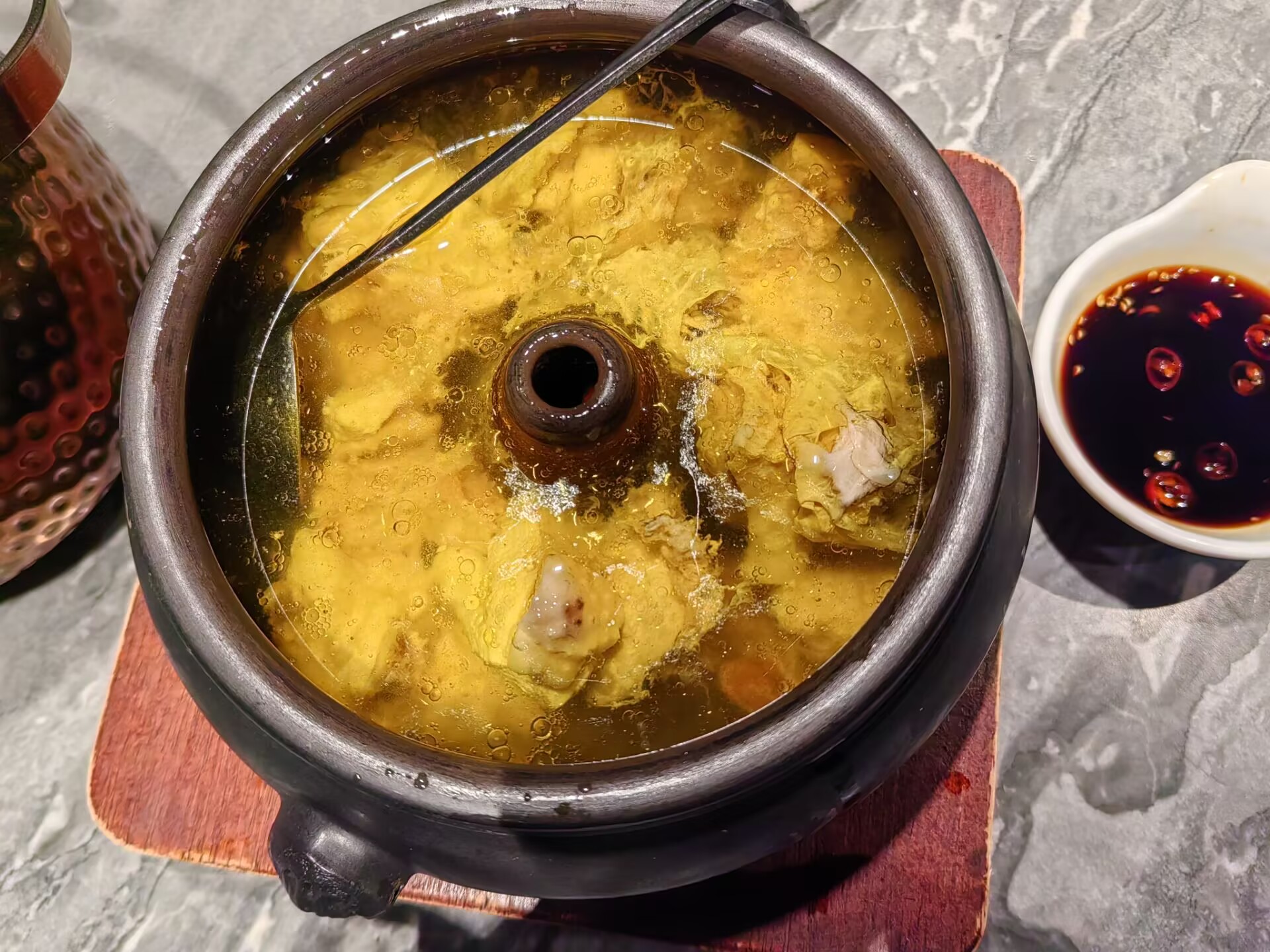 汽锅鸡是一种石锅炖鸡,鸡汤色泽清亮,鸡肉嫩而鲜美。吃鸡肉时,需要佐以蘸料,否则寡淡无味,喝汤时感受到的,除了鸡的油脂香味之外,还有菌类带来的鲜。在汪曾祺的文章中还特别提到过,建水所制的汽锅为宜,我们品尝到的汽锅鸡汽锅也许不是建水所制,但也足够使这种美食名扬千里,至少吸引了我这个四体不勤的宅男。